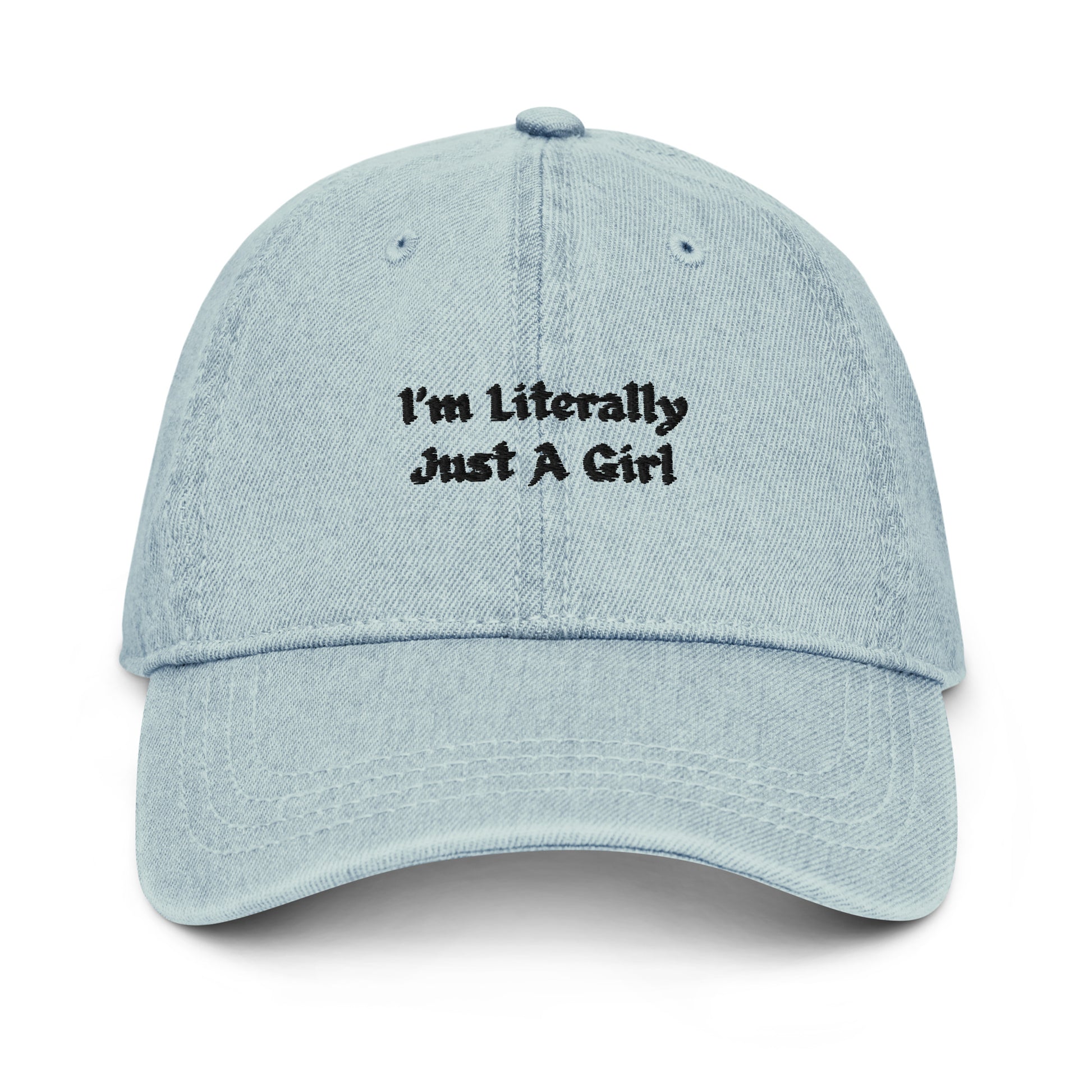 Complement your everyday wardrobe with our Just a Girl denim hat! Made out of 100% cotton, the 6-panel cap offers a light feel, while the adjustable strap ensures a solid and comfortable fit.
